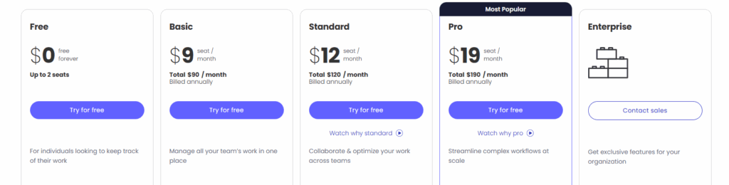 | Free | $0 | Free (Up to 2 users) | 3 boards, 8 column types, mobile app |