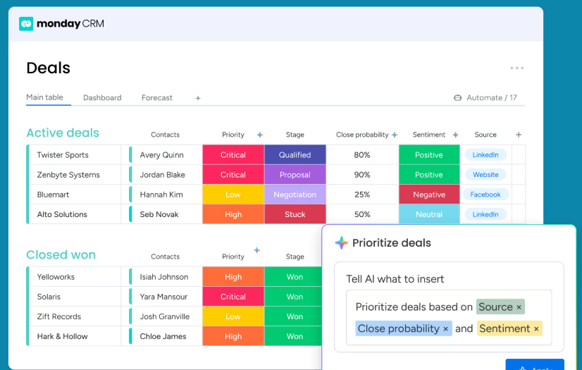 Monday.com isnβt just for project management it can also serve as a powerful CRM to track your sales pipeline, leads, and customer interactions. This feature allows sales teams to manage deals and clients while staying organized and on top of their work.