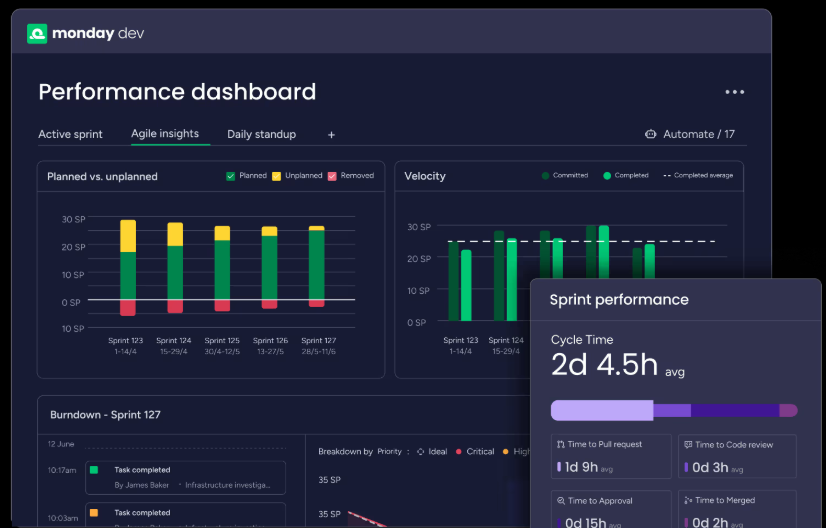 - Dashboards: Track progress across projects, monitor workloads, and visualize data.
