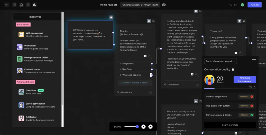 Treble.ai allows businesses to create automated WhatsApp journeys that respond to customers instantly and guide them step by step. Instead of replying manually to every message, you can design flows for welcome messages, lead qualification, follow-ups, order updates, and reminders.
