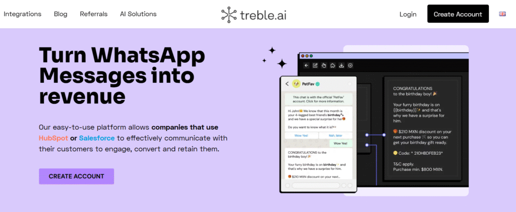One of Treble.ai’s strongest features is its deep CRM integration. Every WhatsApp conversation can be synced directly with platforms like HubSpot and Salesforce, so sales and support teams see complete customer history in one place.